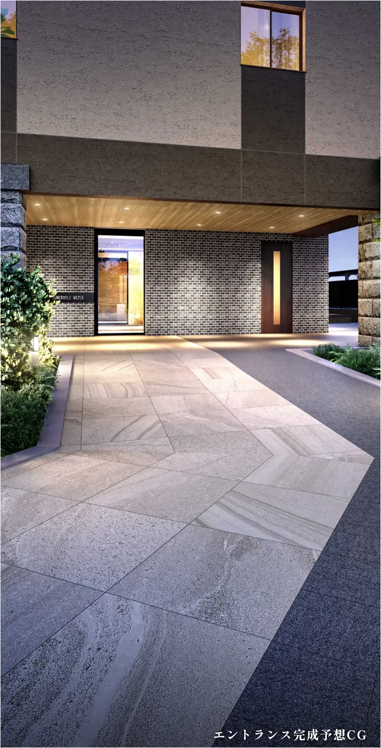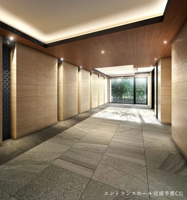 住まう人を温かく迎え入れるエントランスホールは、床・壁にグレー系、ベージュ系の石目調タイルを使用。厳選を重ねた素材が建物の質感を高め、上質な空間を創造しています。