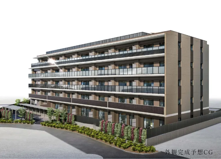 建物のファサードは、自然の風合いときらきらとした素材感を併せ持ち、重厚感のある表情を出せる仕上げを施しました。また、バルコニーにはガラス手摺を採用し、透明感を演出しています。