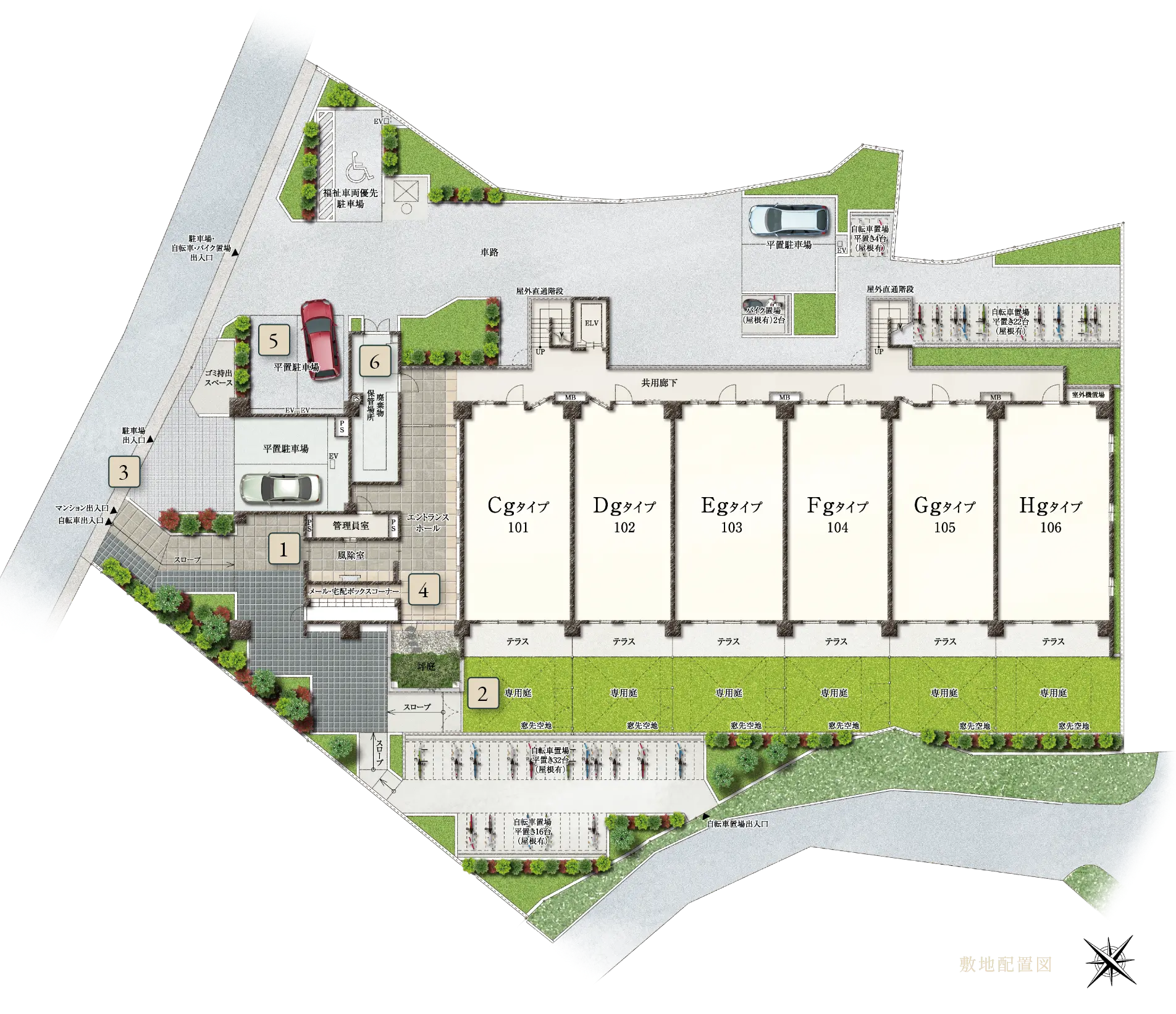 歩行者・自転車・自動車の入り口を3箇所に分けた歩車分離設計を実現しました。
