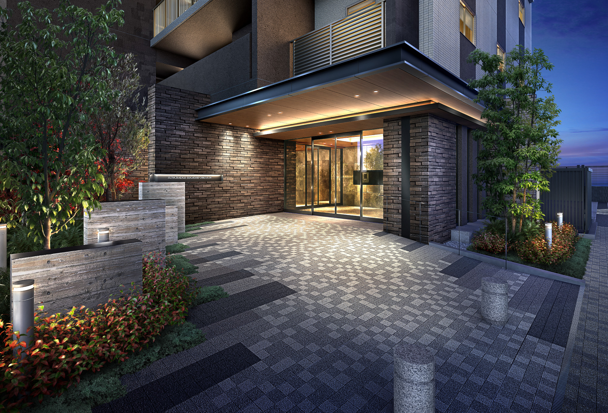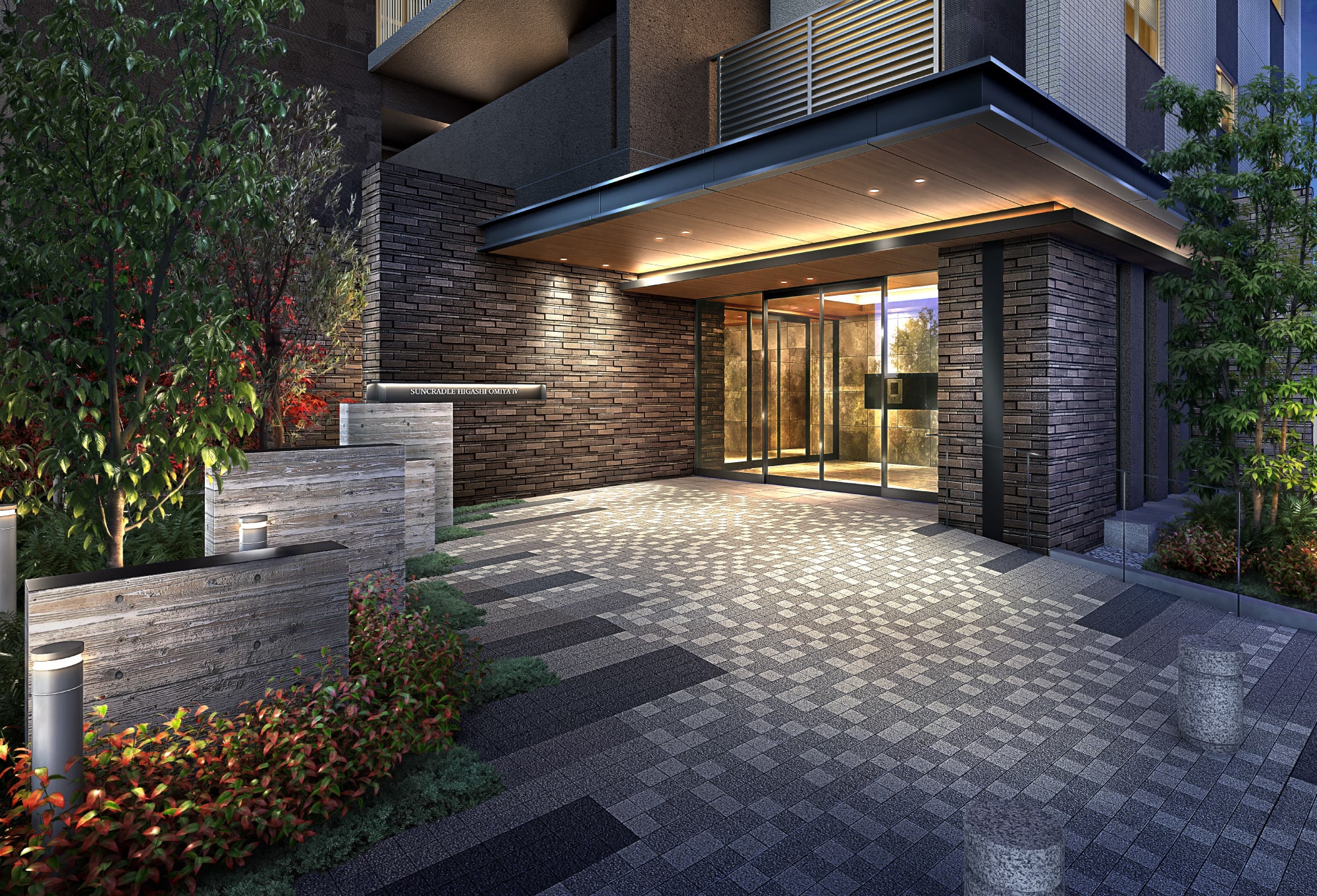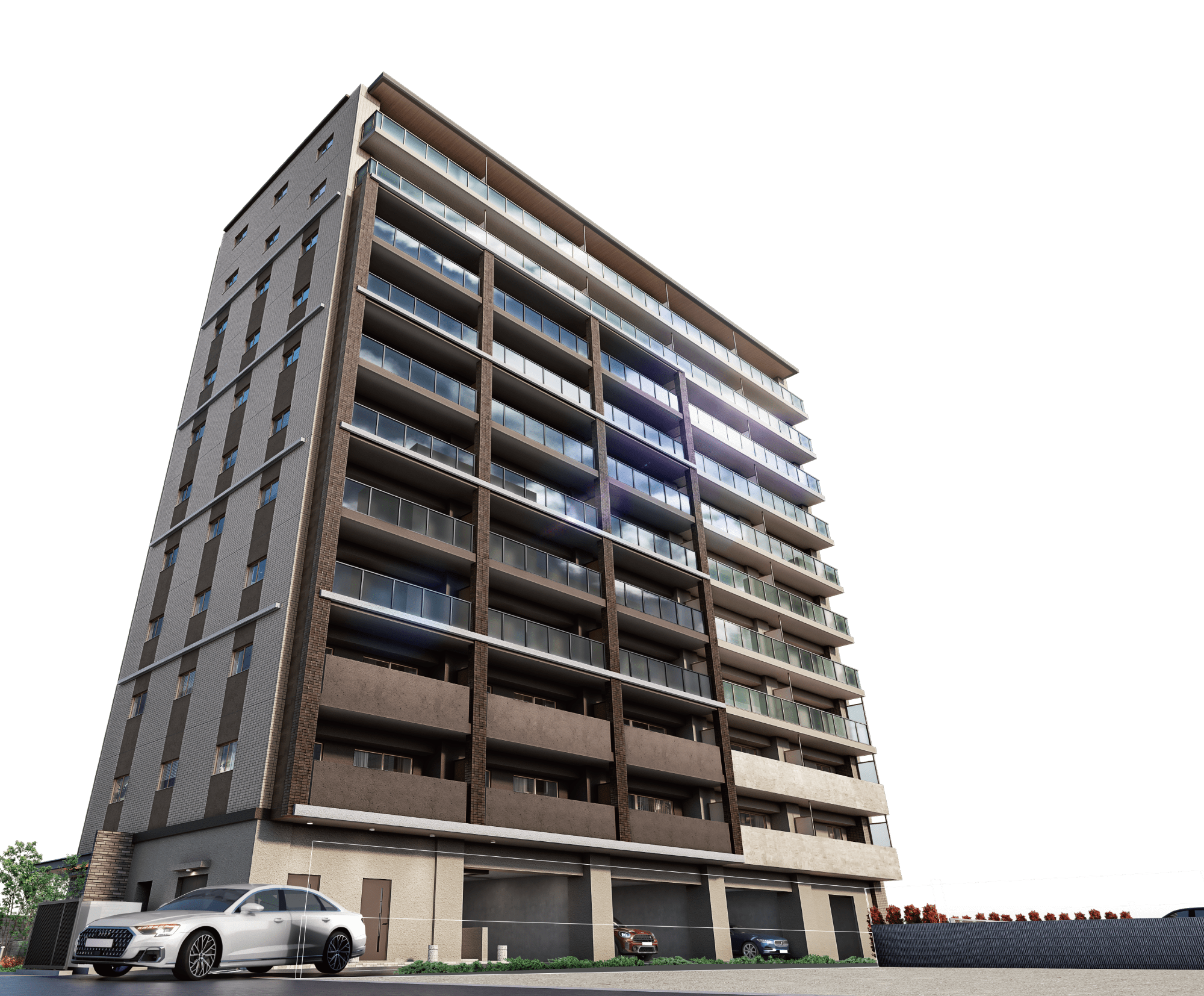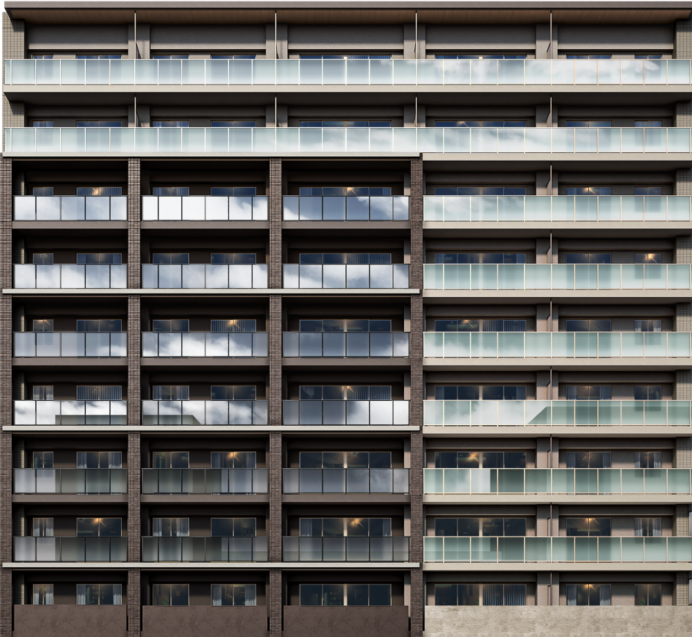 並みに調和しながら、ブラウンを基調としたアースカラーのコンビネーションが上質な存在感を主張するファサード。
