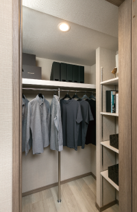 洋服から小物、雑貨まで多彩にしまえる大型収納。ハンガーパイプと棚板を設けて収納力と使い勝手を高めています。