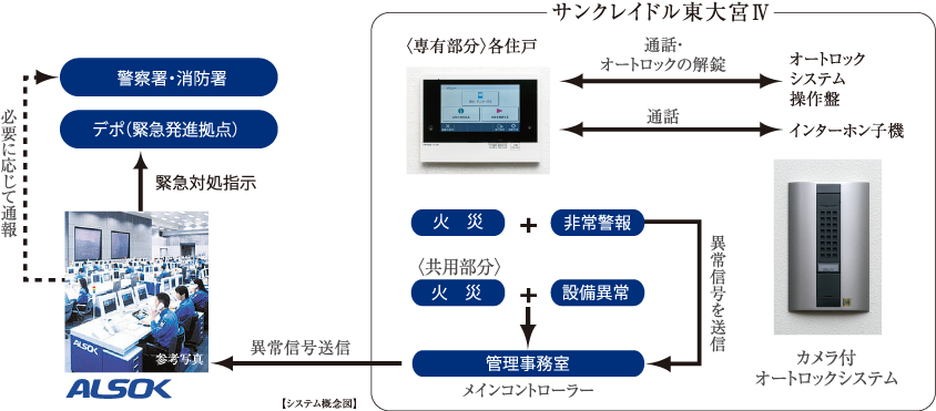 「サンクレイドル東大宮Ⅳ」の暮らしを守る24時間体制のセキュリティシステム。住戸ごとに設置された非常警報装置(火災報知器など)は、管理事務室の集中管理装置経由でALSOKガードセンターへ直結。遠隔監視は24時間体制で、異常事態発生時には警報の内容に応じてALSOKの当該部署がスピーディに対応します。