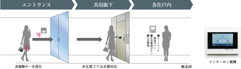 来訪者の姿を住戸内モニターで確認後、遠隔操作でエントランスドアを解錠できるシステムを採用。不審者の侵入を抑制し、マンションライフの安全を確保します。