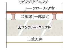 スラブ厚約200mm(1階床スラブを除く)と、居室の天井はスラブの間に空気層のある二重天井、床はフローリング材の二重床構造です。