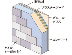 外壁の厚さは約150mm以上の躯体にタイル(一部吹付)を貼った構造で、プラスターボードの内側に断熱材を入れ断熱効果に配慮しています。(一部除く)