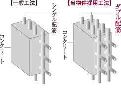 コンクリート内に鉄筋を一列に配置するシングル配筋に対し、鉄筋を二列に配し、建物を支える壁にダブル配筋を採用しています。(一部除く)